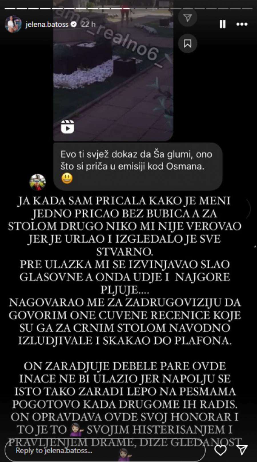 - Nagovarao me za Zadrugoviziju da govorim one čuvene rečenice koje su ga za crnim stolom navodno izluđivale i skakao do plafona. On zarađuje debele pare ovde, inače ne bi ulazio, jer napolju se isto tako zaradi lepo na pesmama pogotovu kada drugome ih radiš. On opravdava ovde svoj honorar i to je to je! Svojim histerisanjem i pravljenjem drame diže gledanost - napisala je Jelena Batos na Instagram profilu.
