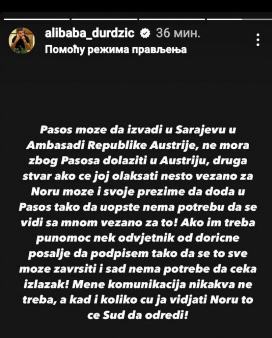 - Pasoš može da izvadi u Sarajevu u Ambasadi Republike Austrije, ne mora zbog pasoša dolaziti u Austriju. Druga stvar, ako će joj olakšati nešto vezano za Noru može i svoje prezime da doda u pasoš tako da nema potrebe da se vidi sa mnom vezano za to! Ako im treba punomoć nek advokat od dotične pošalje tako da se to može završiti i sada nema potrebe da čeka izlazak! Meni komunikacija nikakva ne treba, a kada i koliko ću viđeti Noru, odlučiće sud - napisao je Asmin u svojoj objavi na Instagramu.