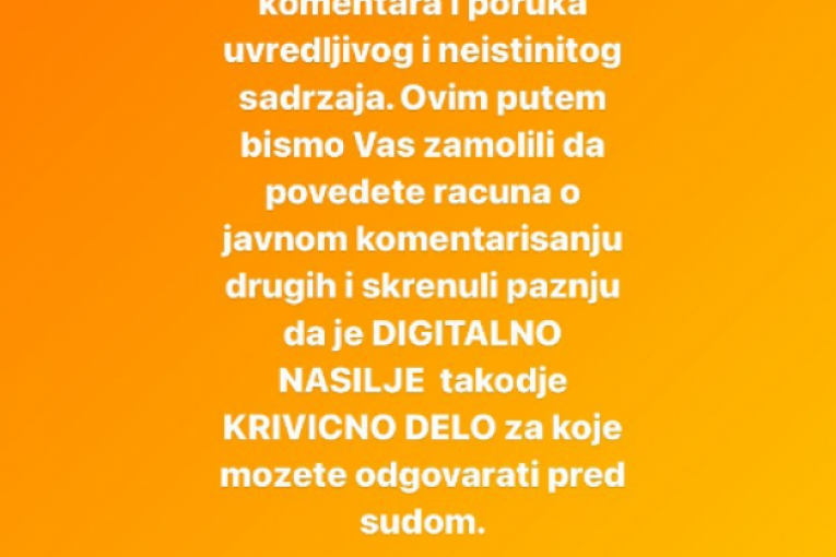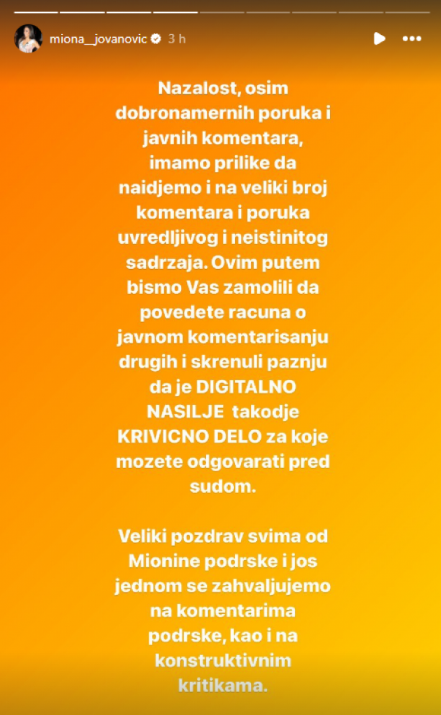 - Nažalost, osim dobronamernih poruka i javnih komentara, imamo prilike da naiđemo i na veliki broj komentara i poruka uvredljivo i neistinitog sadržaja. Ovim putem bismo vas zamolili da povedete računa o javnom komentarisanju drugih i skrenuti pažnju da je digitalno nasilje takođe krivično delo za koje možete odgovarati pred sudom. Veliki pozdrav svima od Mionine podrške i još jednom se zahvaljujemo na komentarima podrške, kao i na konstruktivnim kritikama - završila je Mionina porodica.