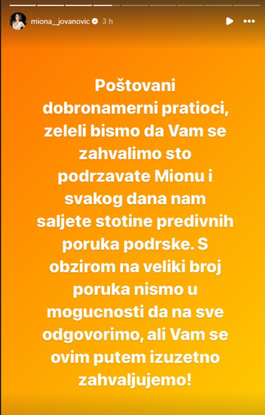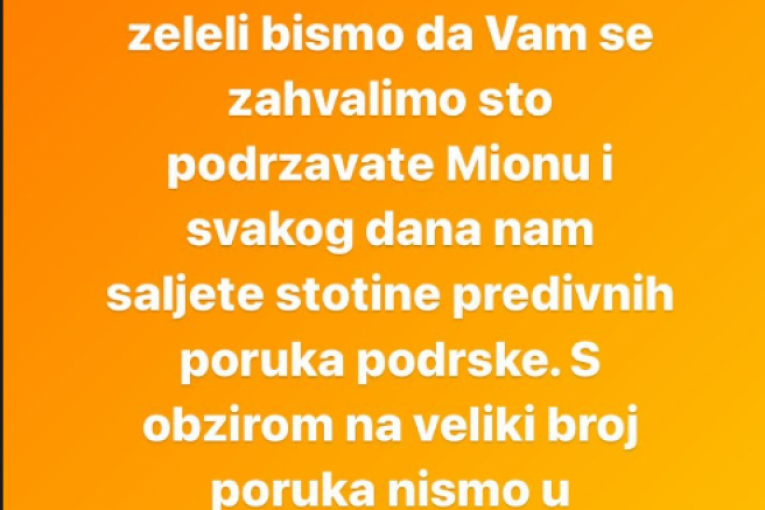 - Poštovani dobronamerni pratioci, želeli bismo da vam se zahvalimo što podržavate Mionu i svakog dana nam šaljete stotine predivnih poruka podrške. S obzirom na veliki broj poruka nismo u mogućnosti da na sve odgovorimo, ali vam se ovim putem izuzetno zahvaljujemo! - glasila je poruka Mionine porodice, a potom su nastavili: