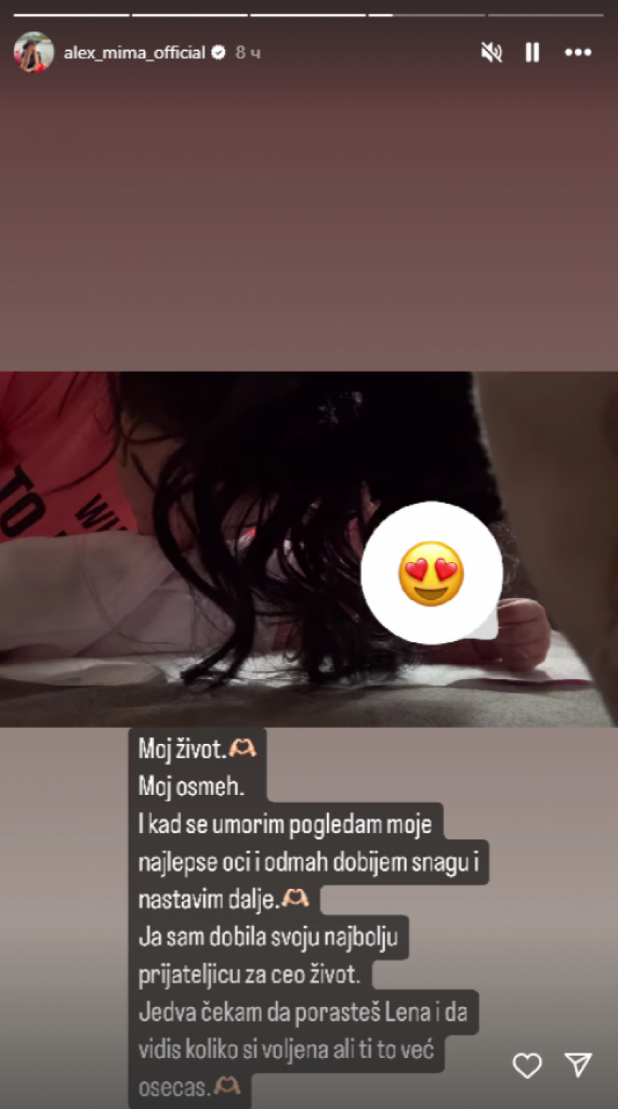 - Moj život. Moj osmeh. I kad se umorim, pogledam moje najlepše oči i odmah dobijem snagu i nastavim dalje. Ja sam dobila svoju najbolju prijateljicu za ceo život. Jedva čekam da porasteš, Lena, i da vidiš koliko si voljena, ali ti to već sada osećaš - napisala je Aleksandra Nikolić.