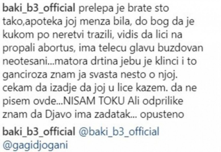 Foto: printscreen/instagram.com/gagidjogani- Prelepa je, brate, što tako, apoteka joj menza bila, dabogda je kukom po Nevervi tražili. Vidiš da liči na propali abortus, ima teleću glavu, buzdovan neotesani. Matora drtina, j*bu je klinci i to ganciroza. Znam ja svašta o njoj. Čekam da izađe da joj u lice kažem, da ne pišem ovde. Nisam u toku, ali otprilike znam da đavo ima zadatak. Opušteno - napisao je Baki B3.