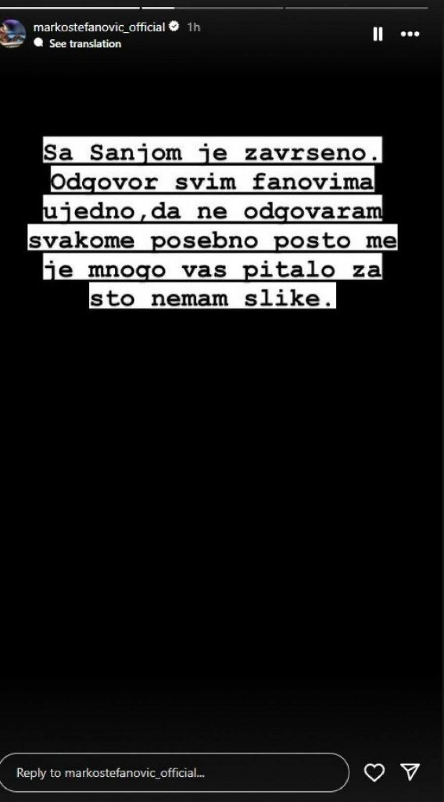 On je putem društvene mreže Instagram uputio poruku svojim pratiocima da ga više ne pitaju za svoju bivšu devojku, nazivajući je "gadurom" i ističući da je kraj njihove veze definitivan. Sa druge strane, Sanja se za sada nije oglašavala povodom ovog događaja.