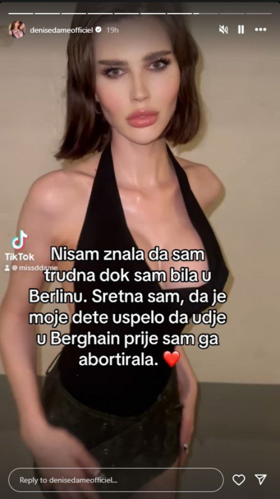- Da, uradila sam abortus. Moje telo - moja odluka. Potreban mi je miran oporavak, molim sve da poštuju moju privatnost. Javljam se kad budem spremna. Mir i ljubav - poručila je Deniz, a njen postupak su mnogi osudili, jer su mislili da će odlučna bila u nameri da postane majka.
