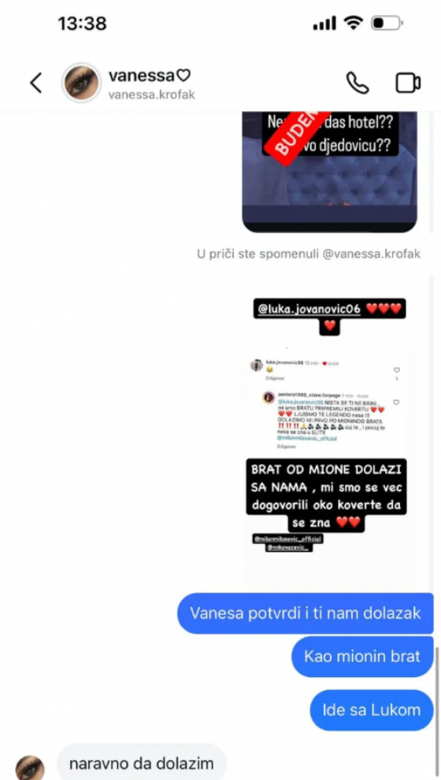 - Brat od Mione dolazi sa nama, mi smo se već dogovorili oko koverte da se zna. Vanesa, potvrdi i ti nama dolazak, kao Mionin brat, ide sa Lukom - stoji u poruci koju su fanovi uputili Vanesi, prenosi Pinkov portal, na šta je ona kratko odgovorila: