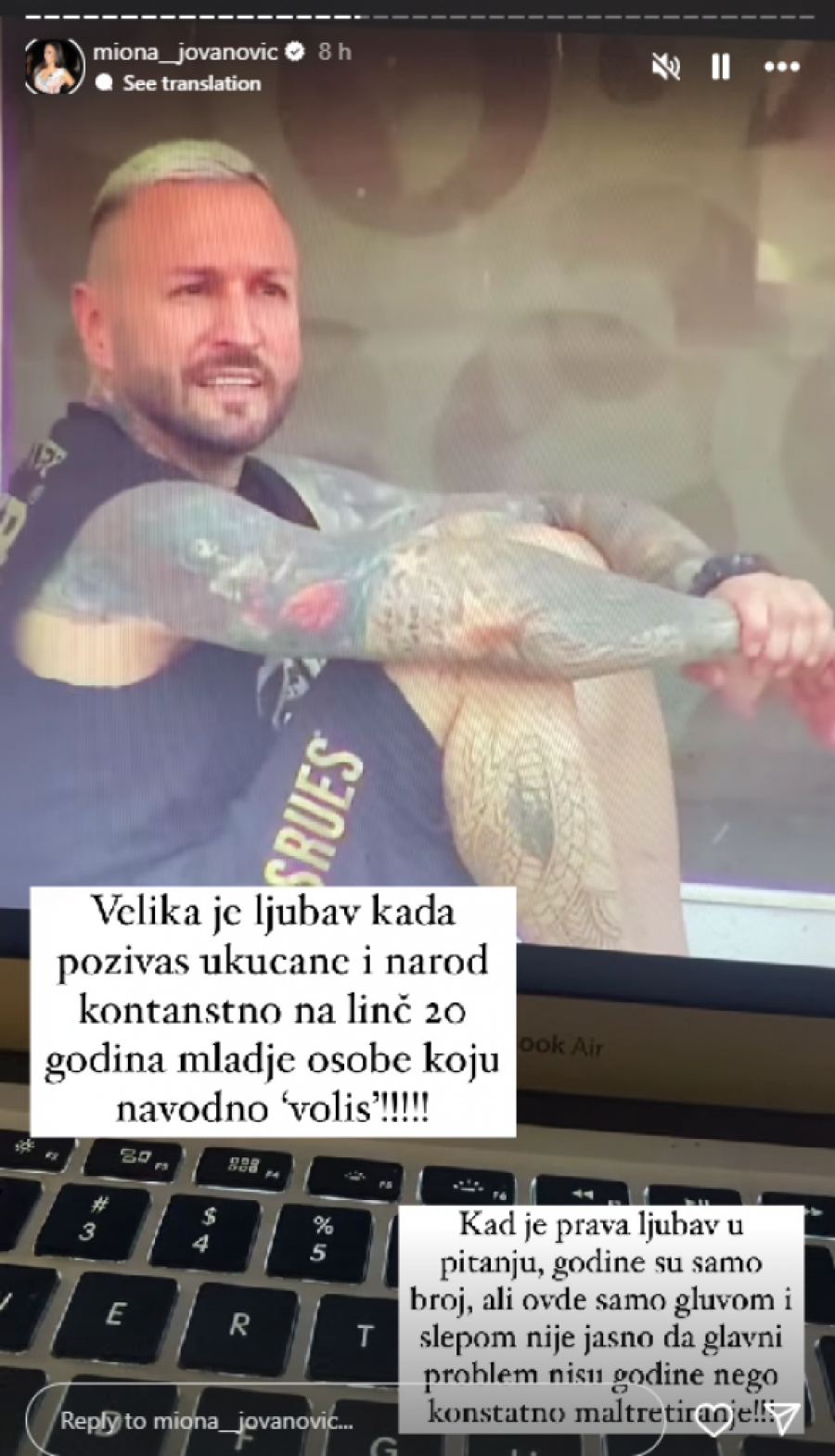 - Velika je ljubav kada pozivaš ukućane i narod konstantno na linč 20 godina mlađe osobe koju navodno ,,voliš". Kada je prava ljubav u pitanju, godine su samo broj, ali ovde samo gluvom i slepom nije jasno da glavni problem nisu godine nego konstantno maltretiranje.