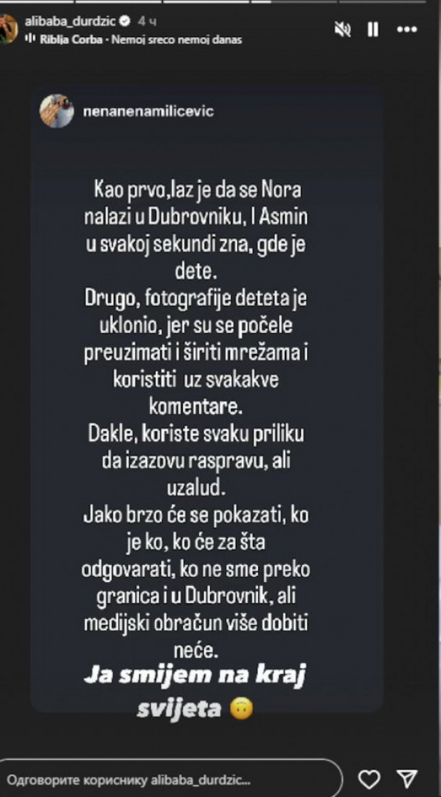 - Kao prvo, laž je da se Nora nalazi u Dubrovniku, i Asmin u svakoj sekundi zna gde je dete. Drugo, fotografije deteta je uklonio, jer su se počele preuzimati i širiti mrežama i koristiti uz svakakve komentare. Dakle, koriste svaku priliku da izazovu raspravu, ali uzalud. Jako brzo će se pokazati ko je ko, ko će za šta odgovarati, ko ne sme preko granica i u Dubrovnik, ali medijski obračun više dobiti neće. Ja smem i na kraj sveta - napisao je Asmin.
