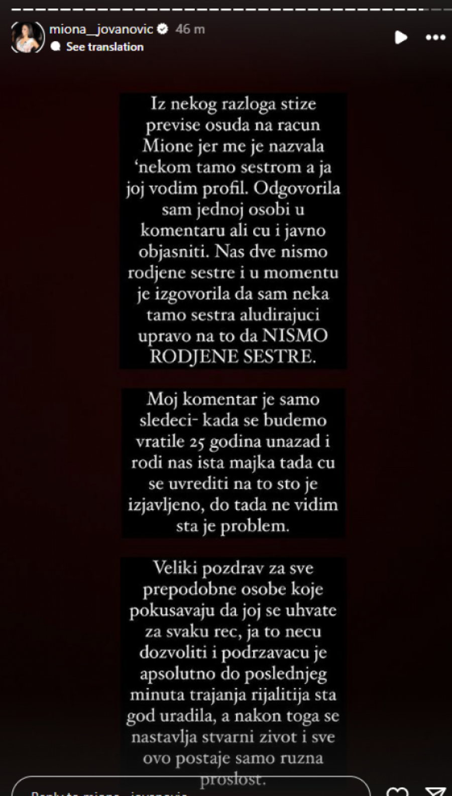 Naime, na Mioninom zvaničnom Instagram profilu njena sestra je izdala obaveštenje, u kom navodi da one nisu rođene sestre, te da joj ne zamera što je imala takvu izjavu, kao i da će je podržavati do samog kraja rijalitija.