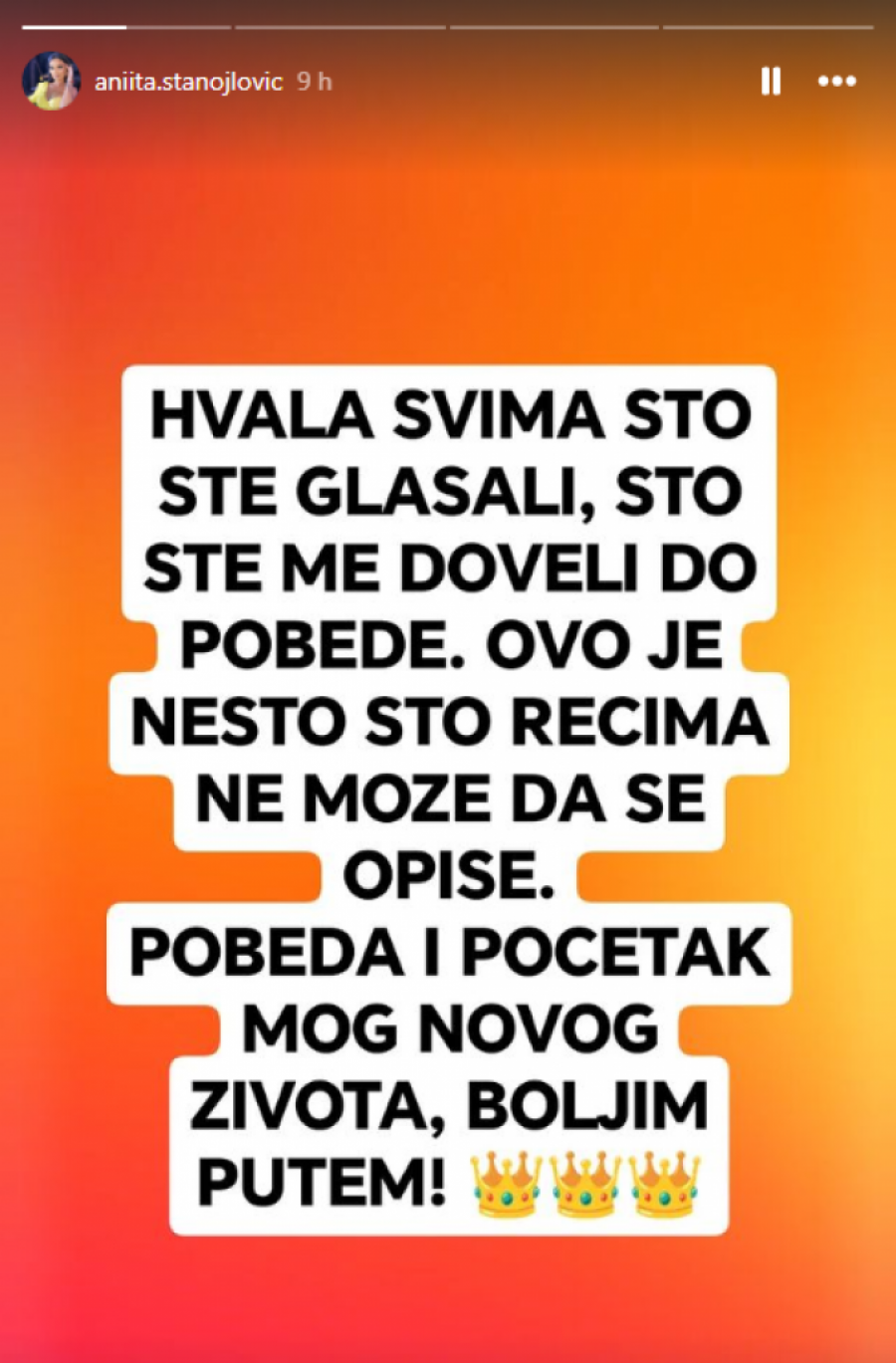 - Hvala svima što ste glasali, što ste me doveli do pobede. Ovo je nešto što rečima ne može da se opiše. Pobeda i početak mog novog života, boljim putem - napisala je Anita na Instagramu.