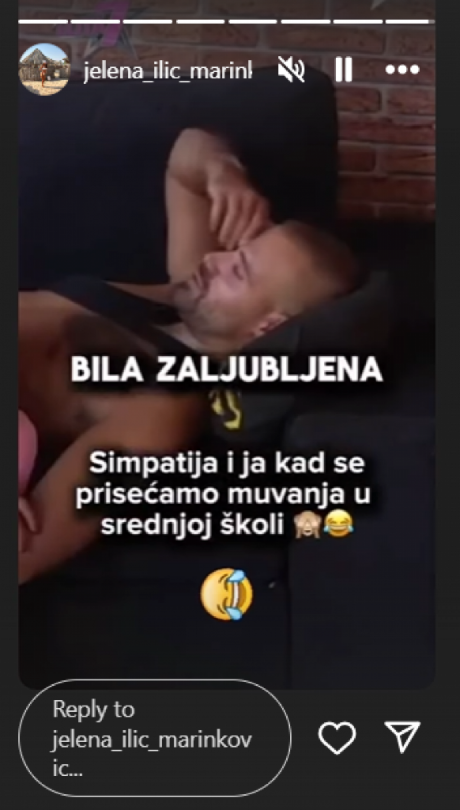 Jelena je podelila klip kome u opisu stoji: "Simpatija i ja kad se muvamo u srenjoj školi!", a dok se udata žena umiljava oko dečka sa kojim je prevarila muža, on je sve vreme drži na tankom ledu i provocira, pa joj u jednom trenutku izgovara sledeću rečenicu:
