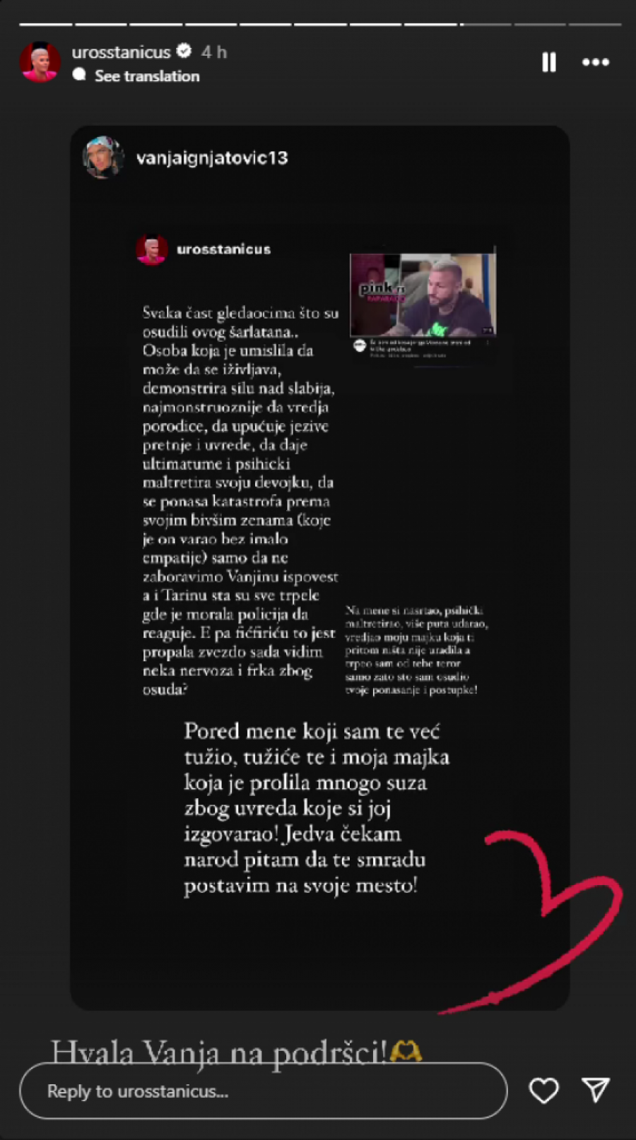 Uroš je preneo kod sebe Vanjih Instagram stori i zahvalio joj se na podršci.