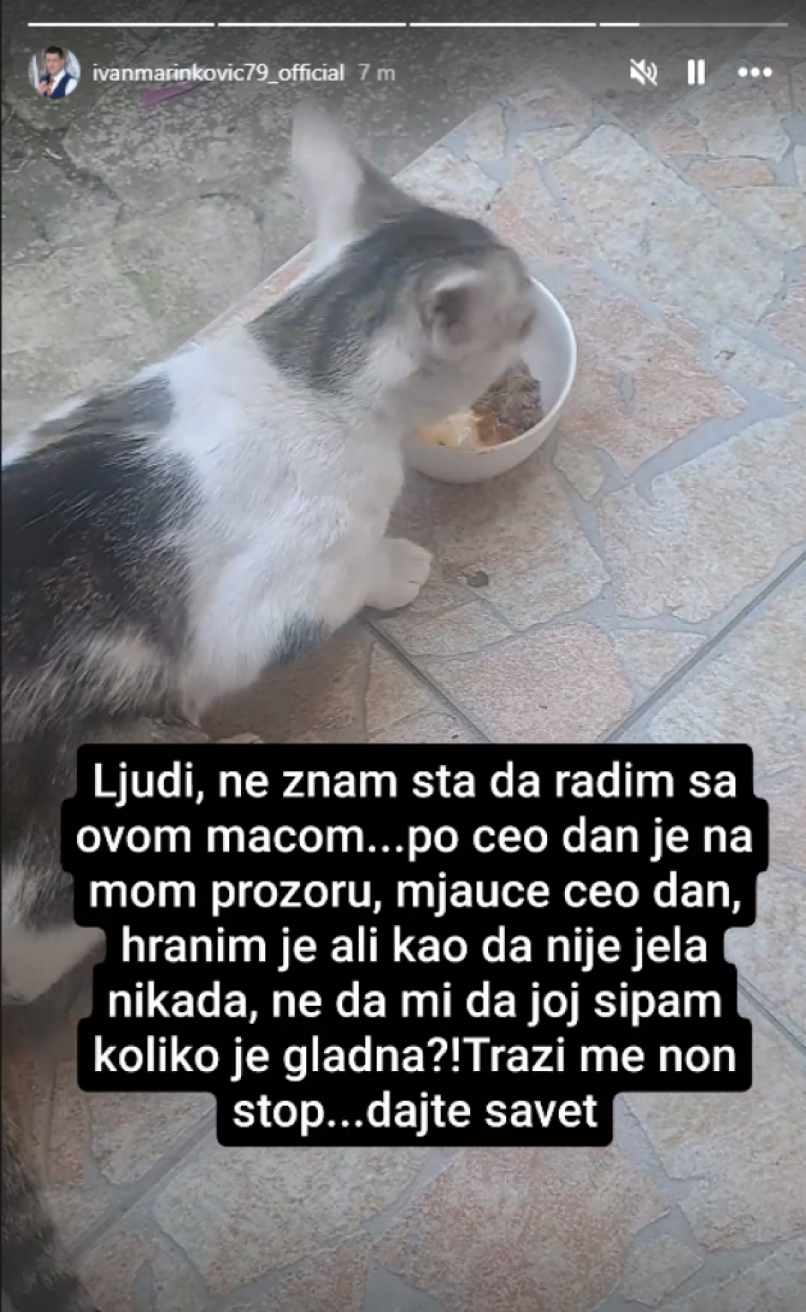 - Ljudi, ne znam šta da radim sa ovom macom... Po ceo dan je na mom porzoru, mjauče ceo dan, hranim je, ali kao da nije jela nikada, ne da mi da joj sipam koliko je gladna?! Traži mi non-stop! Dajte mi savet - napisao je zabrinuto Ivan Marinković koji je objavio snimak mace.