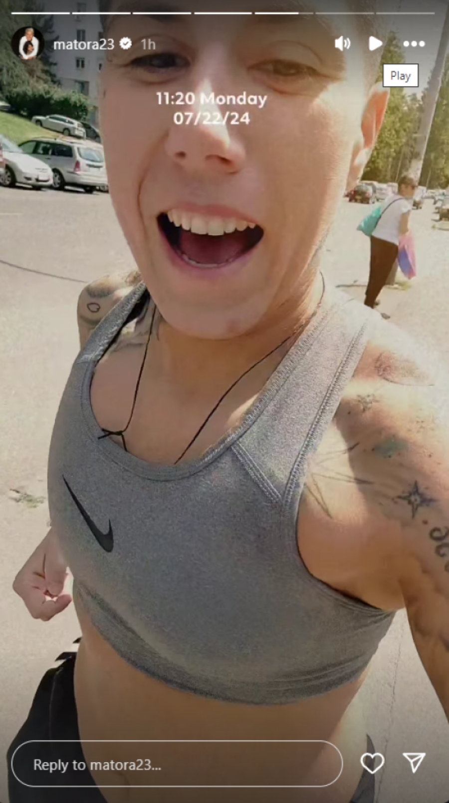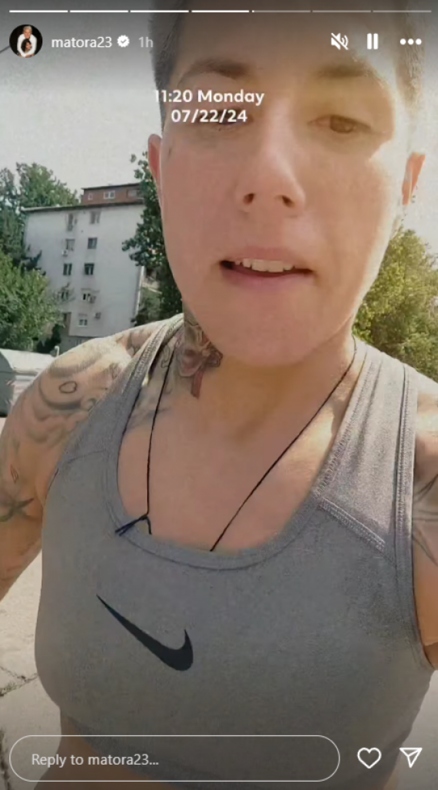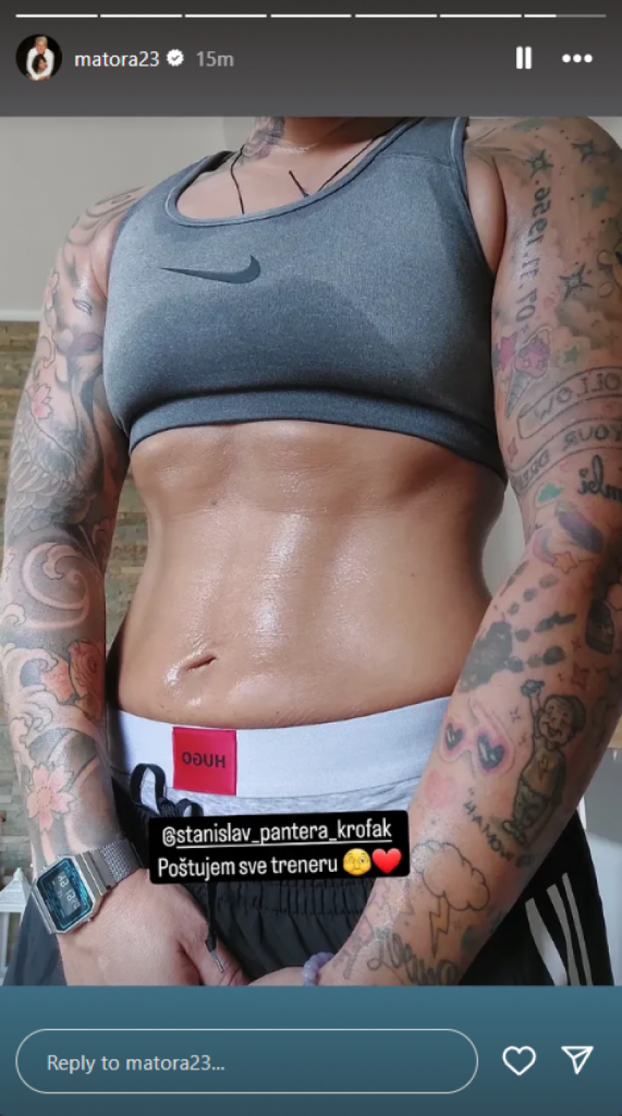 Matora je obukla sportsku opremu koja je malo toga sakrila, a potom krenula na trčanje, nakon čega se oglasila putem storija. Osim treninga, Matora je pokazala i svoje telo, a zatim se zahvalila Stanislavu Krofaku Panteri, koji je njen trener.