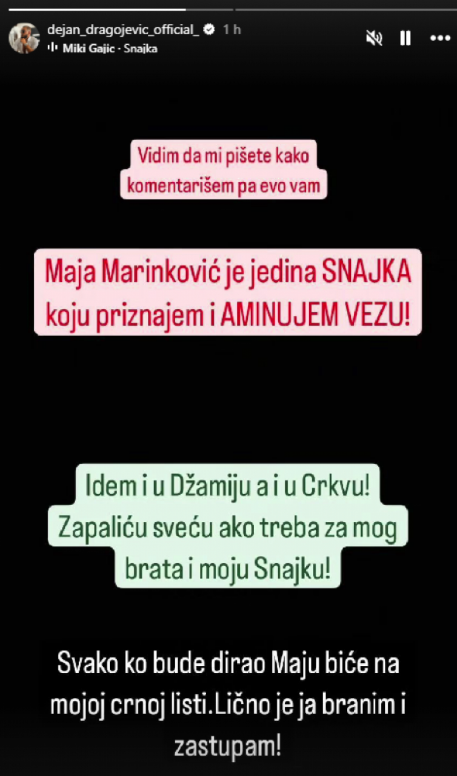 - Vidim da mi pišete kako komentariše, pa evo vam! Maja Marinković je jedina snajka koju priznajem i aminujem vezu! Idem i u džamiju, a i u crkvu! Zapaliću sveću ako treba za mog brata i moju snajku! Svako ko bude dirao Maju, biće na mojoj crnoj listi. Lično je ja branim i zastupam - napisao je Dejan na Instagram storiju, nakon čega su se komentari usijali.