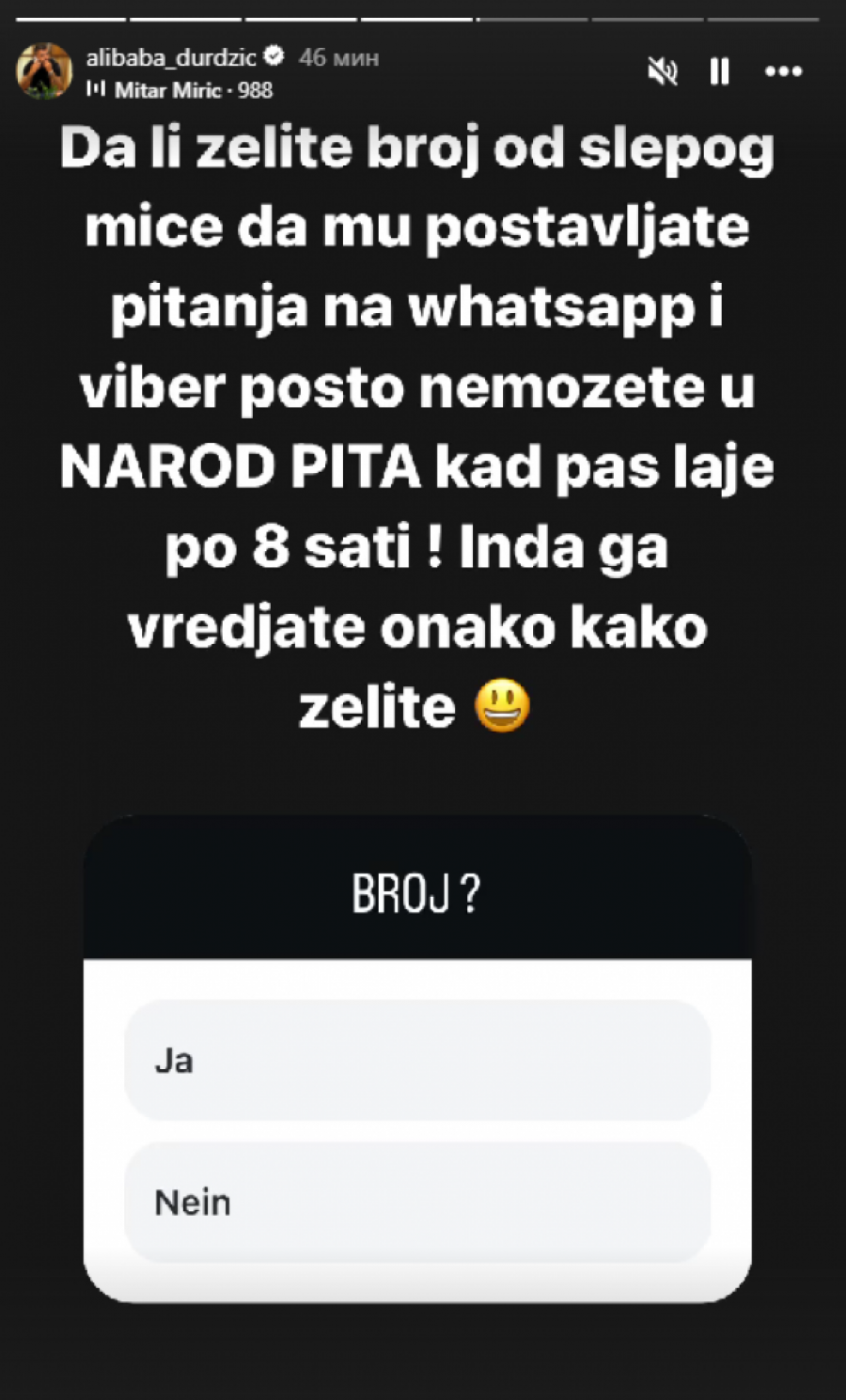 - Da li želite broj od Slepog Miće da mu postavljate pitanja, pošto ne možete u "Narod pita", kad pas laje po osam sati? I da ga vređate onako kako želite - napisao je Asmin.