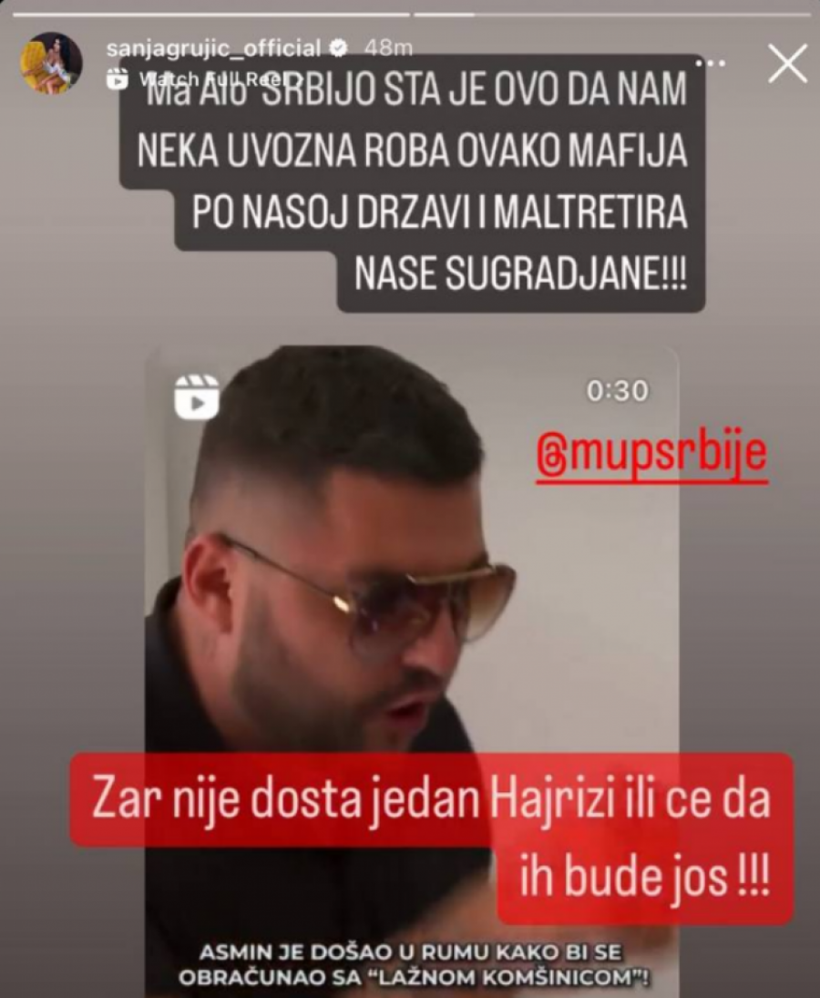 Tim povodom su sada počeli da se oglašavaju bivši zadrugari, među kojima je i starleta Sanja Grujić. Naime, Sanja je na Instagram profilu žestoko oplela po Asminu, tražeći da se protera iz Srbije, zbog bahatog i nasilničkog ponašanja predma državljanu Srbije, odnosno Lepom Mići.