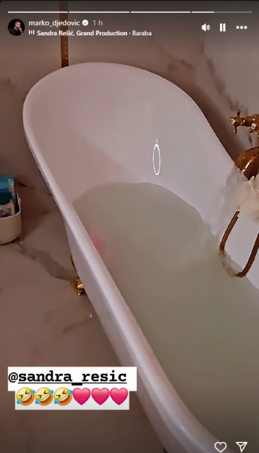 Međutim, izgleda da su ti loši dani iz anjih, budući da je Marko izbacio snimak iz kupatila, kako puni kadu sa vodom, a u pozadini je ostavio Rešićkinu pesmu i označio je na snimku. Uz Sandrino ime stavio je i emotikone srca, pa su njegovi pratioci pomislili da su se Rešićeva i Đedović zvanično pomirili.