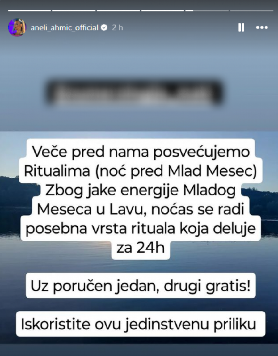 - Veče pred nama posvećujemo ritualima, noć pred mlad mesec. Zbog jake energije mladeov meseca u lavu, noćas se radi posebna vrsta rituala koja deluje za 24h. Uz poručen jedan, drugi gratis! Iskoristite ovu jedinstvenu priliku - stoji u opisu na Instagram profilu Aneli Ahmić.