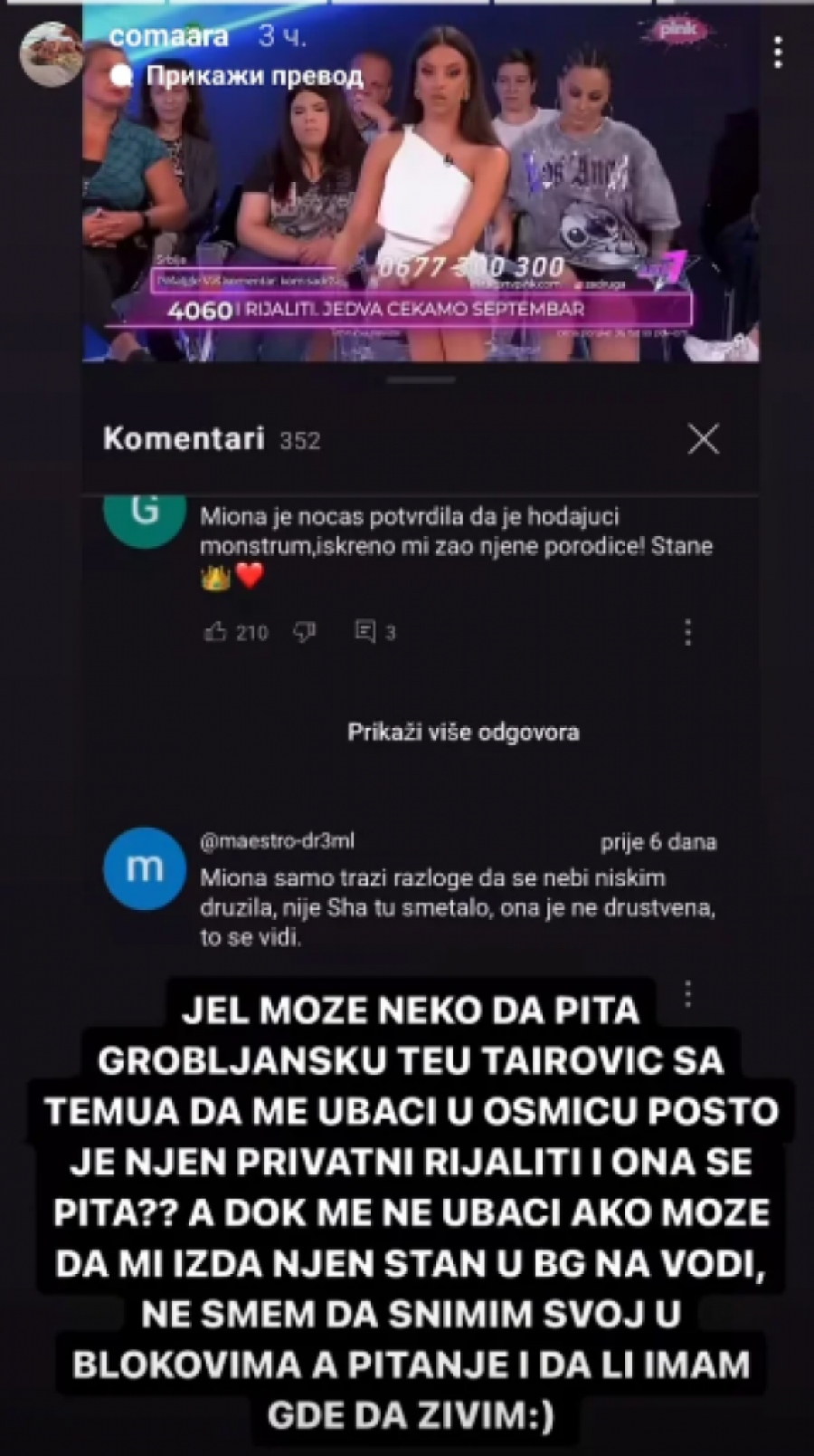 U svom storiju, Milica se obratila "grobljanskoj Tei Tairović", sugerišući ironično "da je ona moćna i da može da utiče na događaje". Pitala je Mionu da je ubaci u Elitu 8, dok je istovremeno izrazila želju da joj izda stan u Beogradu na vodi, za koji je tvrdila da ga ne može koristiti zbog trenutne situacije. Milica je naglasila da ne može da snima svoj stan zbog "blokada", te je postavila pitanje da li uopšte ima gde da živi. Ovaj post jasno pokazuje da Milica nije zaboravila svoje nesuglasice sa Mionom i da je spremna da nastavi sa otvorenim sukobom preko društvenih mreža.