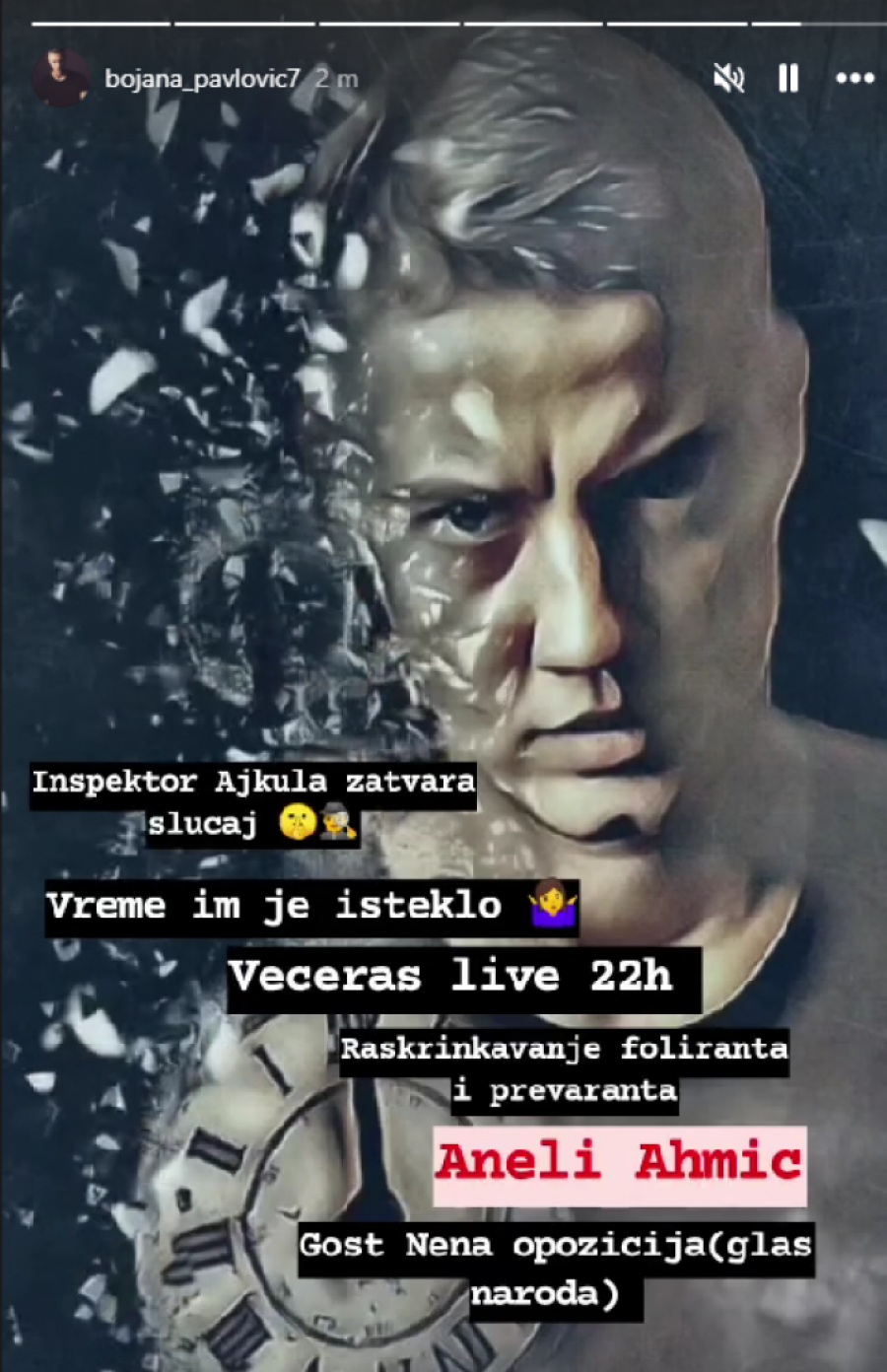 - Inspektor Ajkula zatvara slučaj! Vreme im je isteklo! Večeras uživo u 22 časova! Raskrinkavanje foliranata i prevaranata - Aneli Ahmić - napisala je Bojana Pavlović na Instagram profilu.