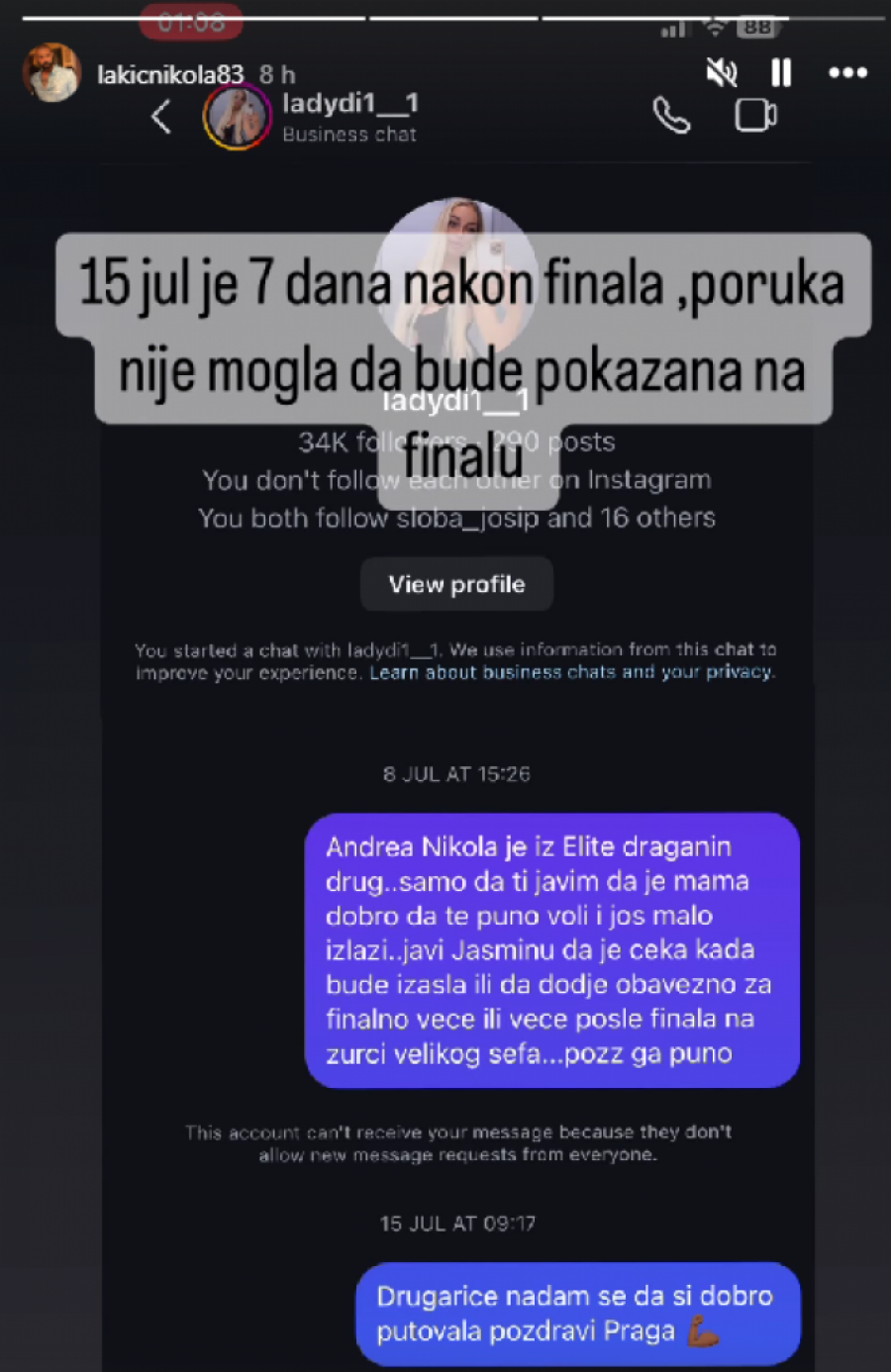 Bivši takmičar "Elite 7" Nikola Lakić rešio je da raskrinka Draganu Sretenović poznatiju kao Lejdi Di i otkrije da je on njoj nakon izlaska iz rijalitija ipak pustio poruku. Prošle noći u emisiji "Narod pita" Lejdi je tvrdila da nikada nije dobila Lakićevu poruku, što je nju iznenadilo i uvredilo, nakon čega se on oglasio na Instagramu i objavio njihovu prepisku.