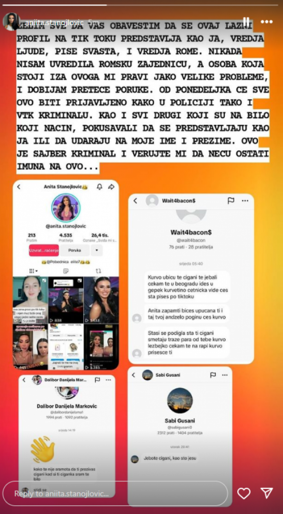 - Želim sve da vas obavestim da se ovaj lažni profil na Tiktoku predstavlja kao ja, vređa ljude, piše svašta, i vređa rome. Nikada nisam uvredila romsku zajednicu, a osoba koja stoji iza ovoga mi pravi jako velike probleme, i dobijam preteće poruke. Od ponedeljka će sve ovo biti prijavljeno policiji tako i visokotehnološkom kriminalu. Kao i svi drugi koji su na bilo koji način pokušavali da se predstavljajukao ja ili da udaraju na moje ime i prezime. Ovo je sajber kriminal i verujte da neću ostati imuna na ovo - napisala je Stanojlovićeva, koja je dobila pretnje smrću.