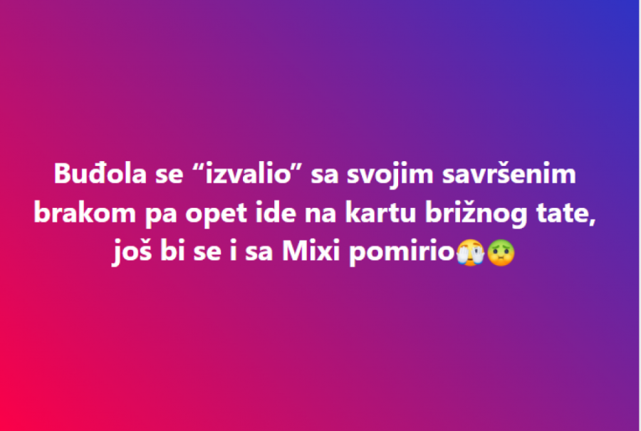 - Buđola se "izvalio" sa svojim savršenim brakom pa opet ide na kartu brižnog tate, još bi se i sa Miljanom Kulić pomirio - glasila je naredna objava.