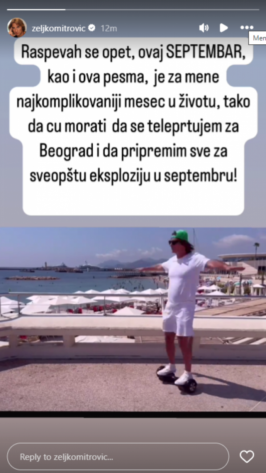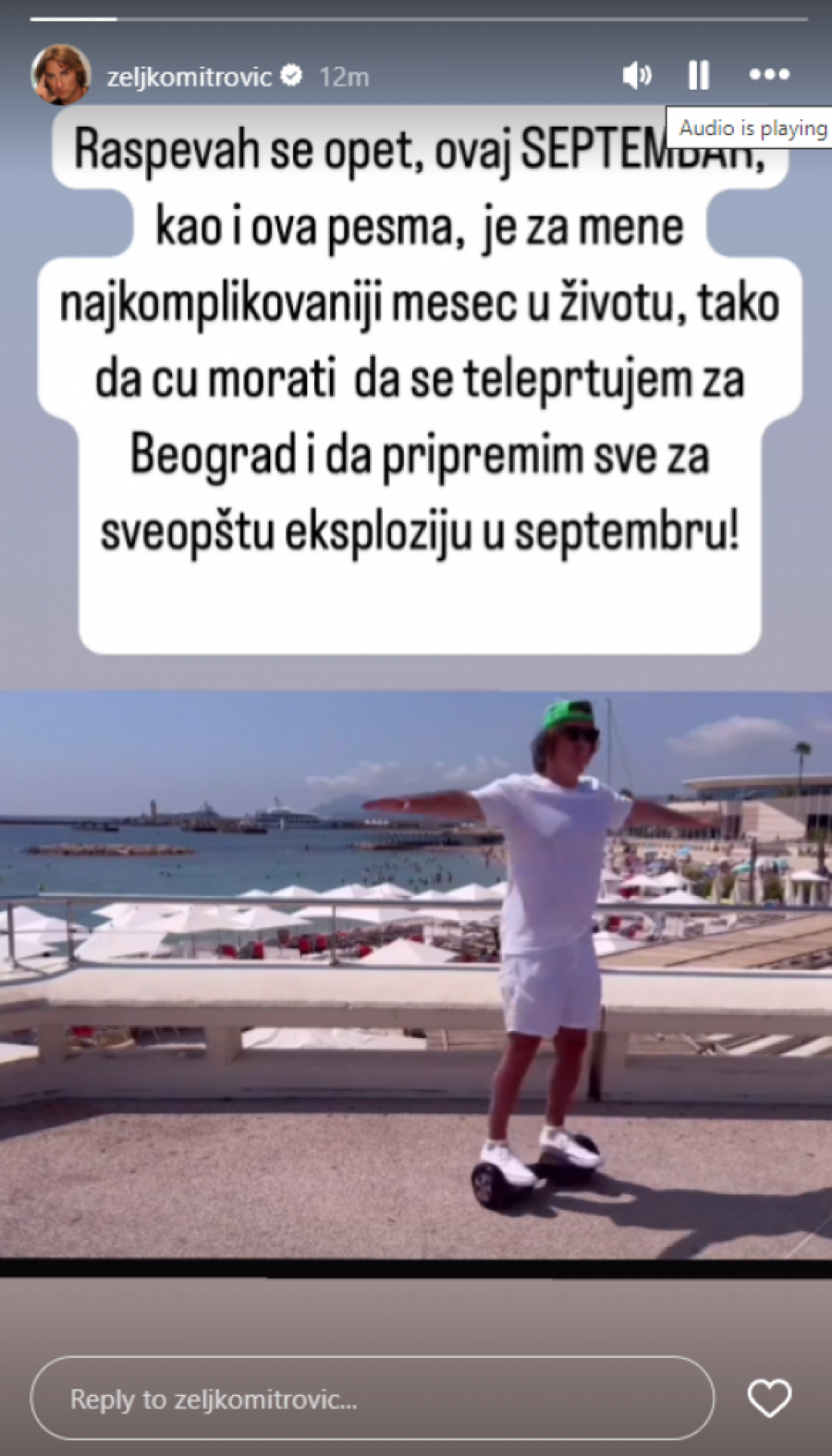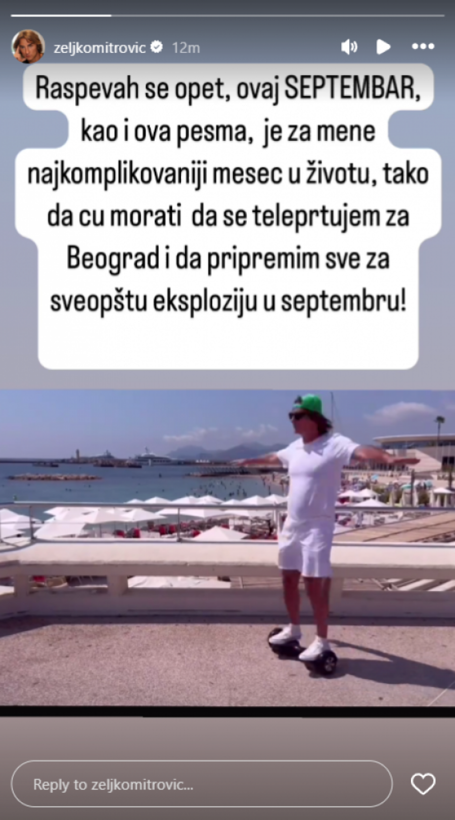 - Raspevah se opet, ovaj SEPTEMBAR, kao i ova pesam, je za mene najkomplikovaniji mesec u životu, tako da ću morati da se teleportujem za Beograd i da priprem sve za sveopštu eksploziju u septembru - najavio je Željko Mitrović.