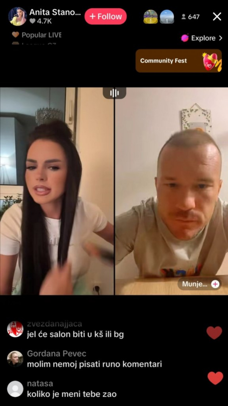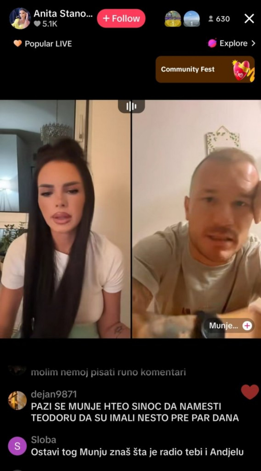 Pobednica "Elite 7" Anita Stanojlović redovno drži lajvove na TikToku, a večeras je odlučila da pozove Danijela Dujkovića Munjeza, dok je njen dečko Anđelo Ranković sa svojim drugarima.