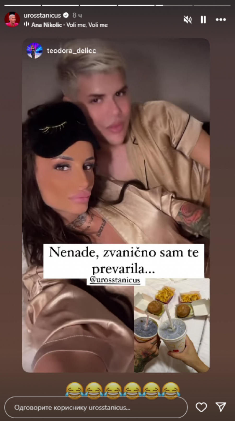 Međutim, pravo iznenađenje usledilo je kada je odmah uveče Teodora podelila snimak iz kreveta s drugim muškarcem, pa Bebici poručila da ga je zvanično prevarila. Naime, u pitanju je neslana šala s obzirom na to da je Delićeva veče provela s Urošem Stanićem, pa je ovu priliku iskoristila da se našali, a Nenad se nije na ovu temu još oglasio. Teodora i Stanić su uživali u hrani, dok su pratili emisiji "Narod pita" u kojoj je gostovao sinoć Bebica, pa je Delićeva pažljivo slušala šta je imao da kaže o njihovoj vezi: