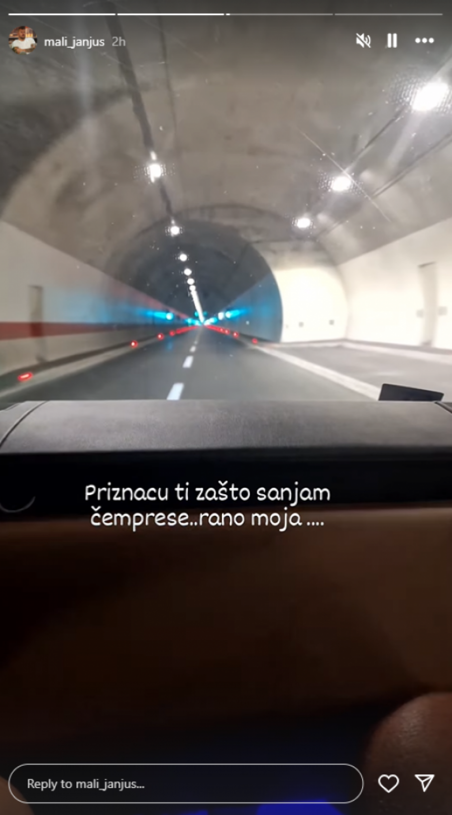 Naime, na snimku koji je objavio na storiju društvene mreže Instagram, Janjuš se ponovo uputio ka Crnoj Gori i u tunelu glasno pustio emotivnu pesmu Parnog valjka "Jesen u meni".
