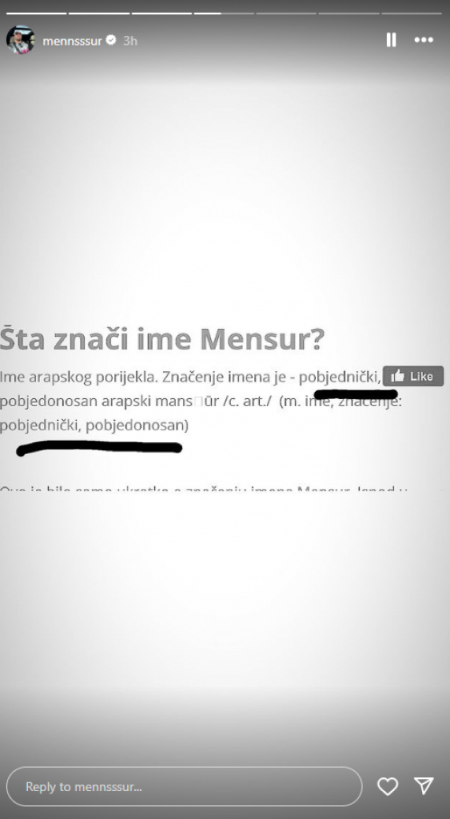 - Šta znači ime Mensur? Ime je arapskog porekla, a značenje imena je pobednički, pobedonosan, nastalo od arapskog mans us - objasnio je bivši rijaliti učesnik.