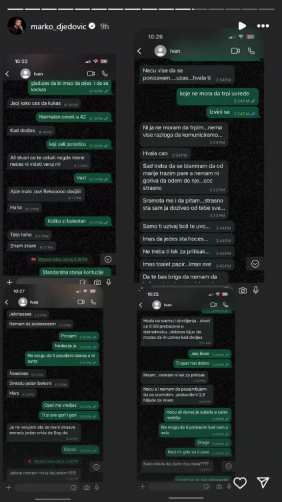 U jednoj od poruka, Ivan ističe da nema šta da jede, dok Jelena odbija da mu uplati novac, iako je on moli za finansijsku pomoć, naglašavajući da je u teškoj situaciji.