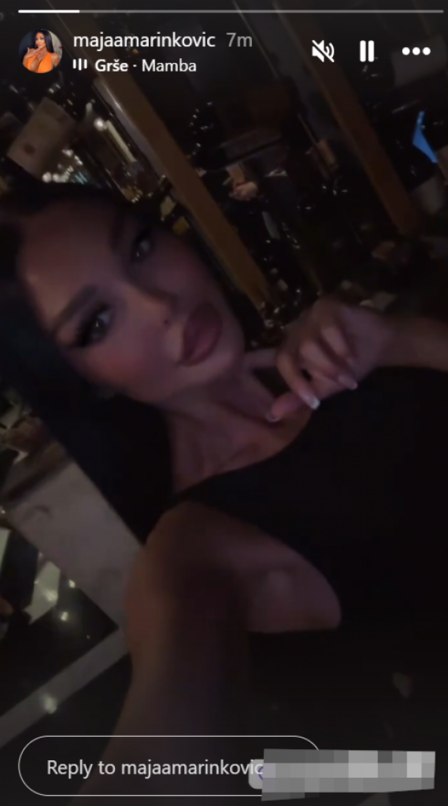 Maja je konačno rešila da prekine ćutnju i oglasila se javno putem svog profila na društvenoj mreži Instagram. Kraljica tajnih signala i poruka na sebi je nosila crnu haljinicu i provpkativno namignula, za sada, nepoznatoj osobi. Uz snimak je objavila i pesmu "Mamba" i pokazala kako uživa u jednom prestoničkom restoranu.