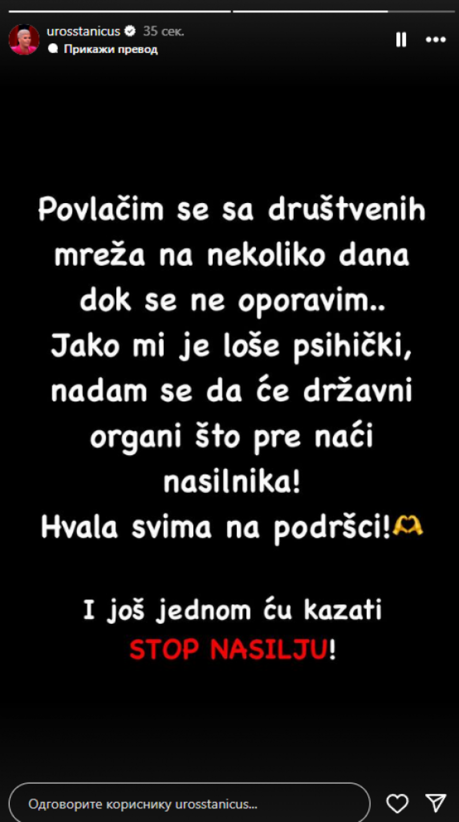 - Jako me je strah. Moram da promenim mesto boravka na nekoliko dana, dok se nasilnik ne pronađe. Vrat me jako boli, dobio sam terapiju. Osećam se jadno, jer ništa nisam uradio da me neko napadne. Policija traga za njim, nadam se da će ga uskoro pronaći. Ne smem više da šetam sam ulicom. Ono što sam čuo je da se ponašao neprikladno prema zaposlenima i ranije u prodavnici gde se desio incident. Moja majka se jako potresla, loše je. Ne mogu da je smirim. Ona će doći kod moje drugarice, gde ću boraviti kako bi me videla - rekao je Uroš kroz suze, a nakon toga rekao da se povlači iz javnosti.