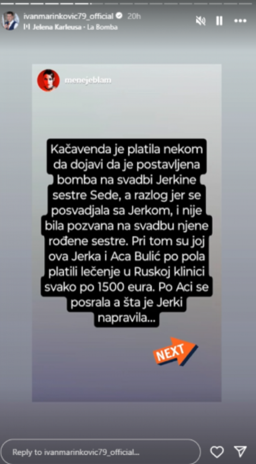 Naime, Marinković je ripostovao objavu sa profila na kojem se navodi da je Kačavenda navodno platila nekome kako bi dojavio da je podmetnuta bomba na jednoj svadbi, sve u svrhu osvete jer nije bila pozvana na svadbu svoje rođene sestre. Ova optužba dodatno je zaoštrila njihov sukob i izazvala pažnju javnosti.
