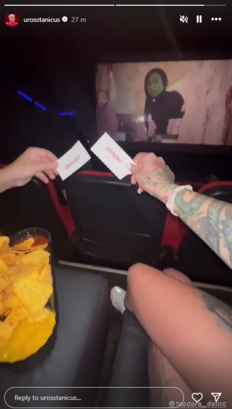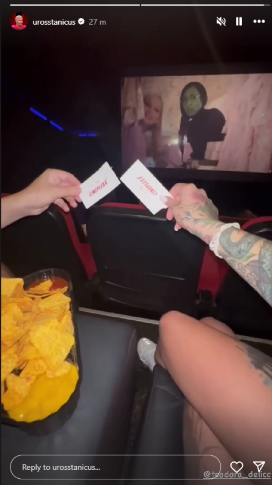Bivši takmičari rijalitija "Elita 7", Uroš Stanić i Teodora Delić, proveli su opuštajuću noć u beogradskom bioskopu u društvu jedno drugog. Nakon završetka takmičenja, njih dvoje su očigledno održali prijateljski odnos, te su odlučili da zajedno provedu veče uz dobar film.