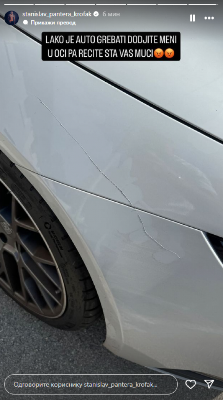 Bivši učesnik rijalitija "Elita 7", Stanislav Krofak, izazvao je pažnju javnosti objavom slike svog izgrebanog automobila na društvenim mrežama. Na slici se jasno vide duboki tragovi ogrebotina duž bočne strane vozila, a Krofak je uz sliku napisao poruku upućenu hejterima.
