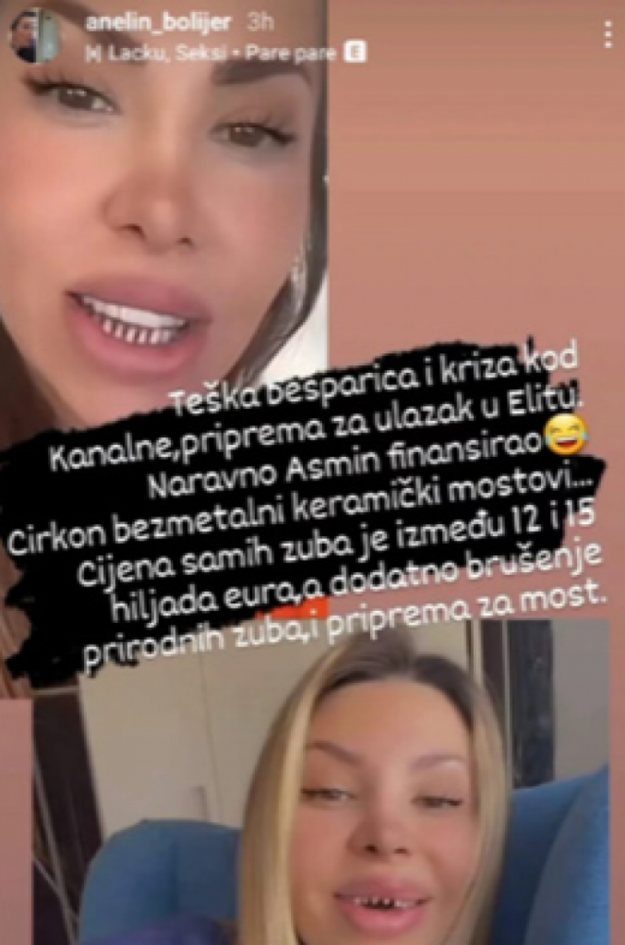 - Teška besparica i kriza kod Kanalne, priprema za ulazak u rijaliti. Naravno Asmin finansirao cirkon, bezmetalni keramički mostovi… Cena samih zuba je između 12 i 15 hiljada evra, a dodatno brušenje prirodnih zuba, i priprema za most - stajalo je u opisu fotografije za koju se sumnja da je u javnost pustio Asmin Durdžić, bivši suprug Aneli Ahmić.
