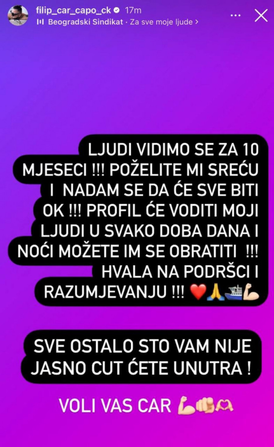 Ljudi, vidimo se za 10 meseci! Poželite mi sreću i nadam se da će sve biti okej. Profil će voditi moji ljudi. Za sve im se možete obratiti - napisao je on na Instagramu.