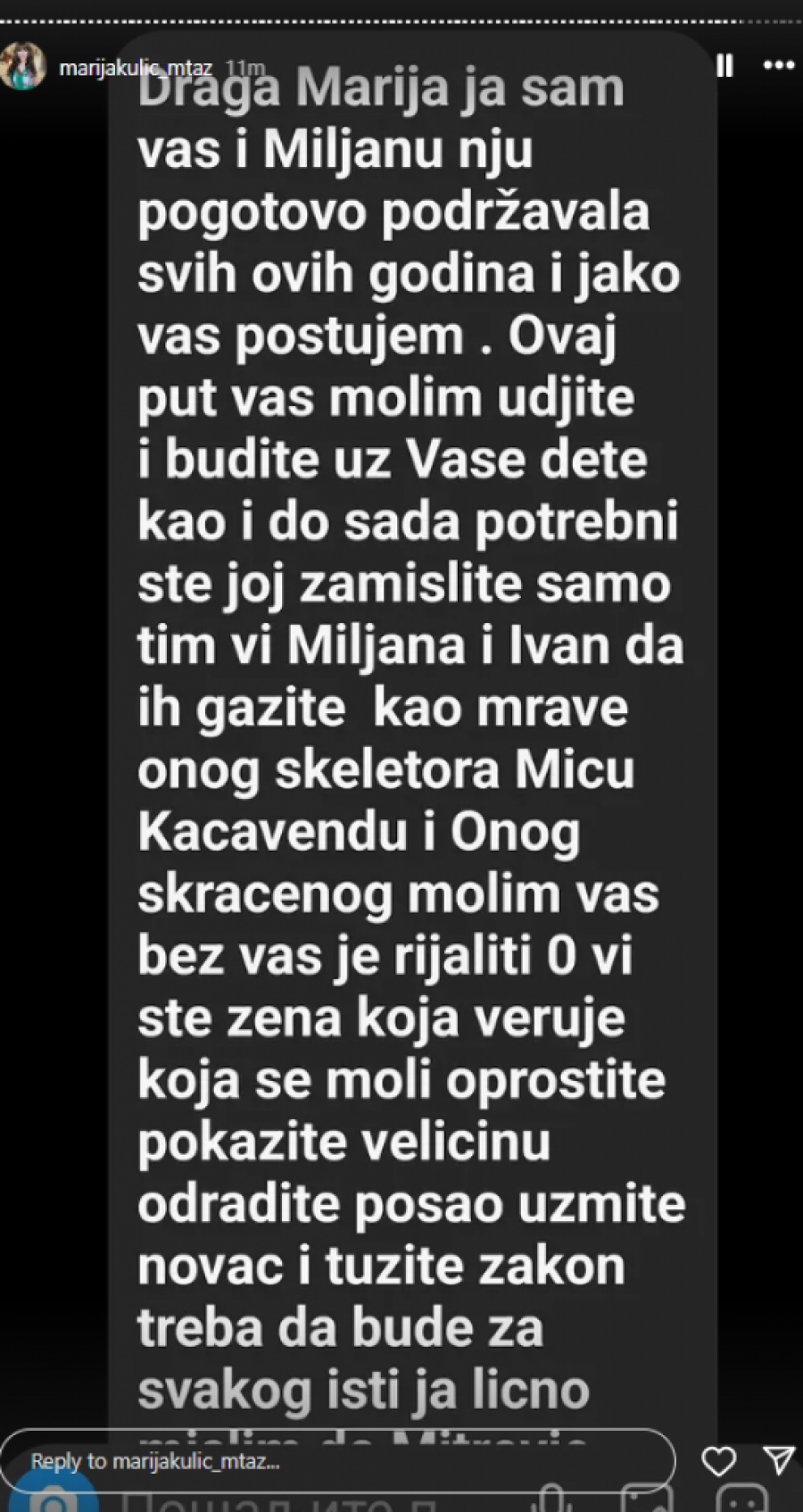 - Draga Marija, ja sam Vas i Miljanu, nju pogotovo, podržavala svih ovih godina i jako vas poštujem. Ovaj put Vas molim: uđite i budite uuz svoje dete, kao i do sada. Potrebni ste joj. Zamislite samo: tim Vi, Miljana i Ivan da ih gazite kao mrave - onog skeletora Miću, Kačavendu i onog Skraćenog. Molim Vas, bez Vas je rijaliti 0. Vi ste žena koja veruje, koja se moli, oprostite, pokažite veličinu. Odradite posao, uzmite novac i tužite - zakon treba da je za sve isti - glasila je samo jedna u moru molbi koje su bile upućene popularnoj Nišlijki.