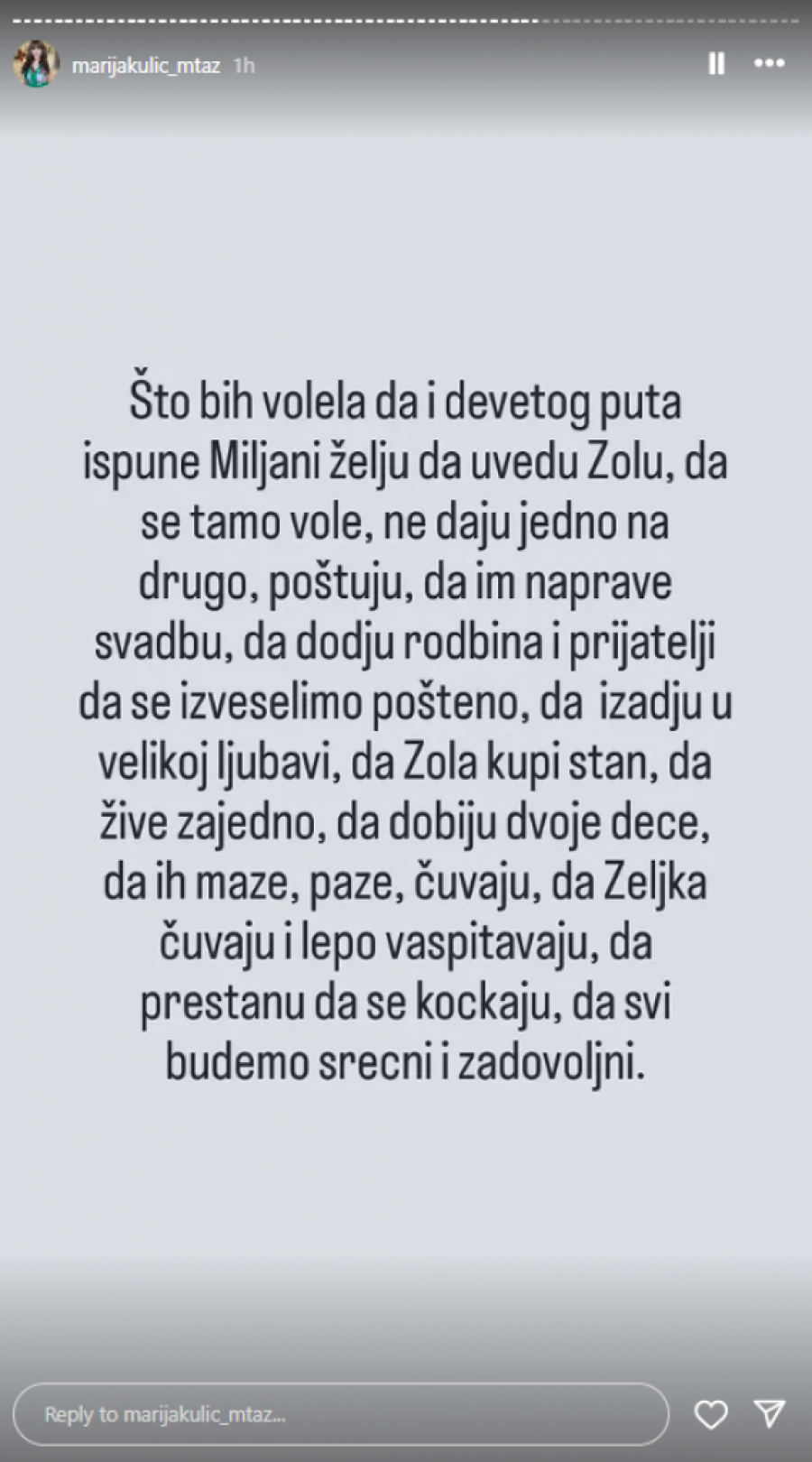- Što bih volela da i deveti put ispune Miljani želju da uvedu Zolu, da se tamo vole, ne daju jedno na drugo, poštuju, da im naprave svadbu, da dođu porodica i prijatelji, da se izveselimo pošteno. Da izađu u velikoj ljubavi, da Zola kupi stan, da žive zajedno i dobiju dvoje dece. Da ih maze, paze, čuvaju, da Željka čuvaju i lepo vaspitavaju, da prestanu da se kocaju, da svi budemo srećni i zadovoljni - napisala je Marija Kulić.