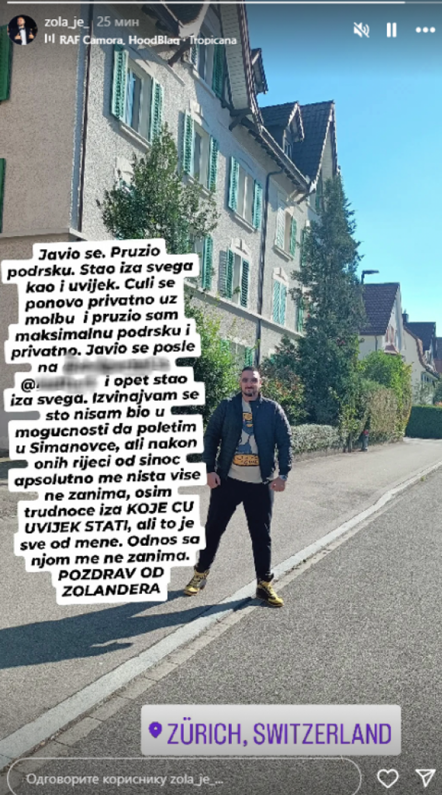 - Javio se, pružio podršku, stao iza svega, kao i uvek. Čuli se ponovo privatno uz molbu i pružio sam maksimalnu podršku i privatno. Izvinjavam se što nisam bio u mogućnosti da poletim u Šimanovce, ali nakon onih reči od sinoć me apsolutno ništa više ne zanima, osim trudnoće, iza koje ću uvek da stanem, ali to je sve od mene. Odnos sa njom me ne zanima. Pozdrav od Zolandera - poručio je Zola.