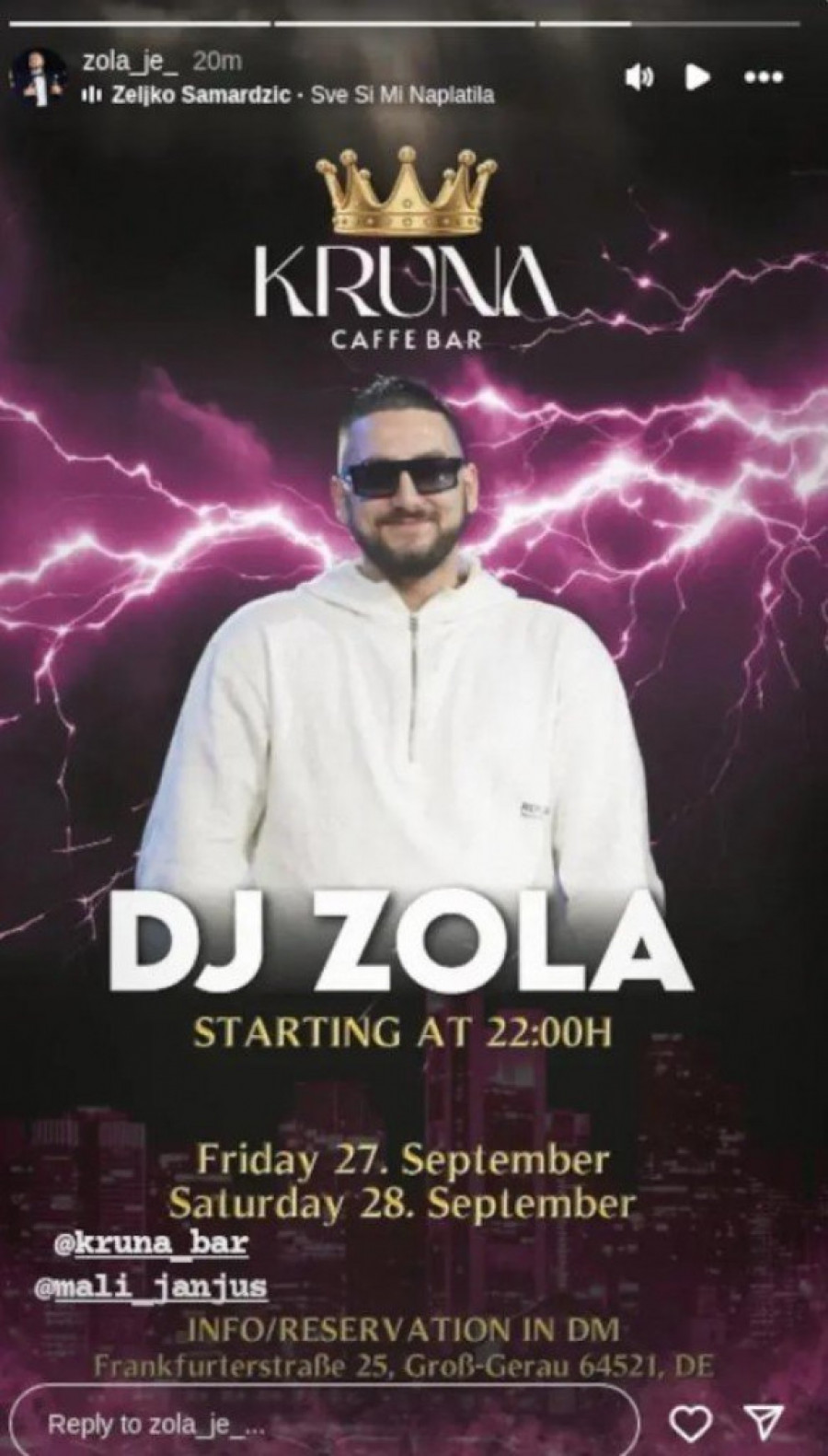 Prema poslednjim infomarmacijama Zola je donedavno bio u Švajcarskoj, međutim, kako je objavljeno na njegovom Instagramu, ovog petka i subote gostovaće u kafiću svog druga Marka Janjuševića Janjuša, koji je nedavno otvorio u Nemačkoj.