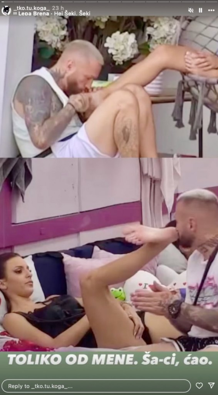 Međutim, situacija se promenila kada je na jednoj popularnoj Instagram stranici, posvećenoj dešavanjima iz rijalitija, objavljen snimak koji je šokirao javnost. Na tom snimku se jasno vidi kako reper Nenad Aleksić Ša uživa u trenutku sa Mionom, i sočno uživa u njenim petama. Ovaj prizor izazvao je oprečna mišljenja među fanovima.