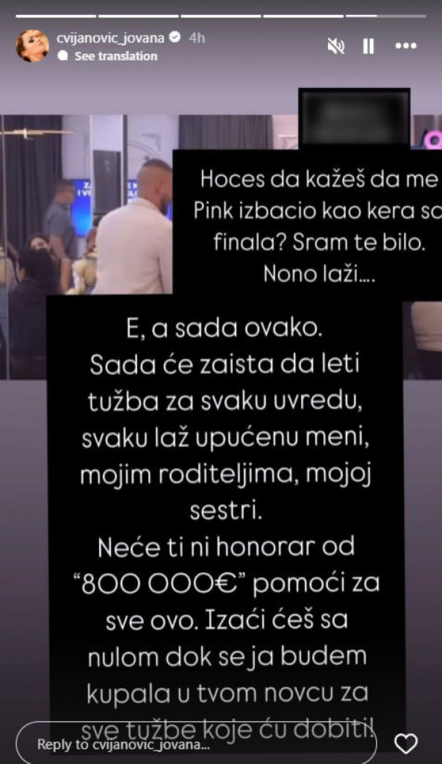 - E, a sada ovako. Sada će zaista da leti tužba za svaku uvredu, svaku laž upućenu meni, mojim roditeljima, mojoj sestri. Neće ti ni honorar od "800.000 evra" pomoći za sve ovo. Izaći ćeš sa nulom, dok se ja budem kupala u tvom novcu za sve tužbe koje će dobiti - poručila je, te objavila privatne prepiske sa njim kao dokaze.