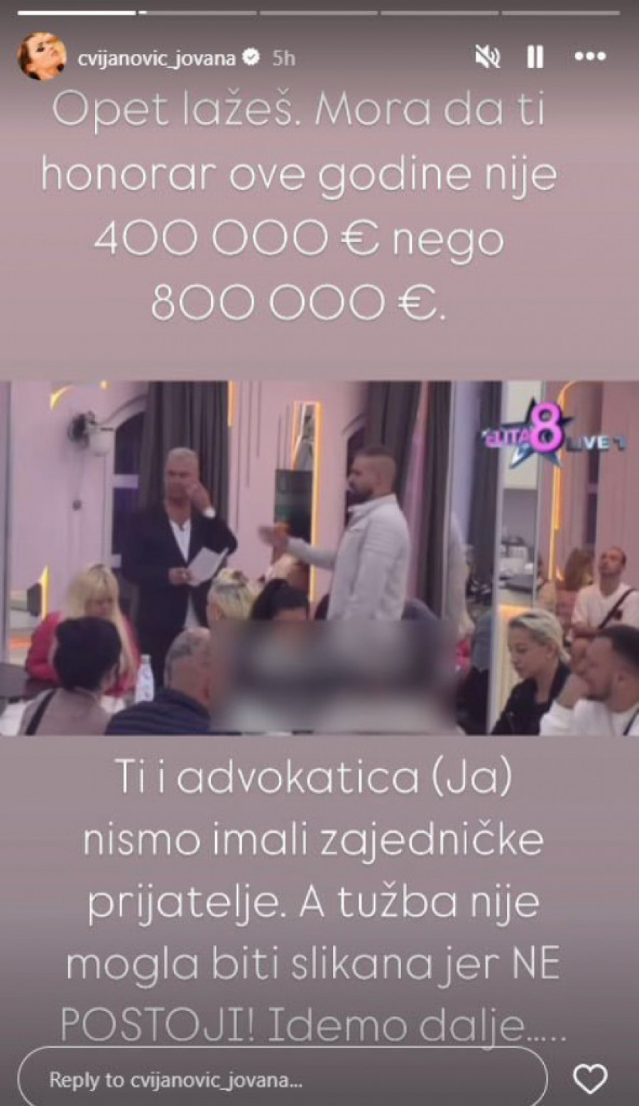 - Opet lažeš. Mora da ti honorar ove godine nije 400.000 evra, nego 800.000 evra. Ti i advokatica (JA) nismo imali zajednike prijatelje. A tužba nije mogla biti slikana, jer NE POSTOJI! Idemo dalje... - započela je, pa nastavila: