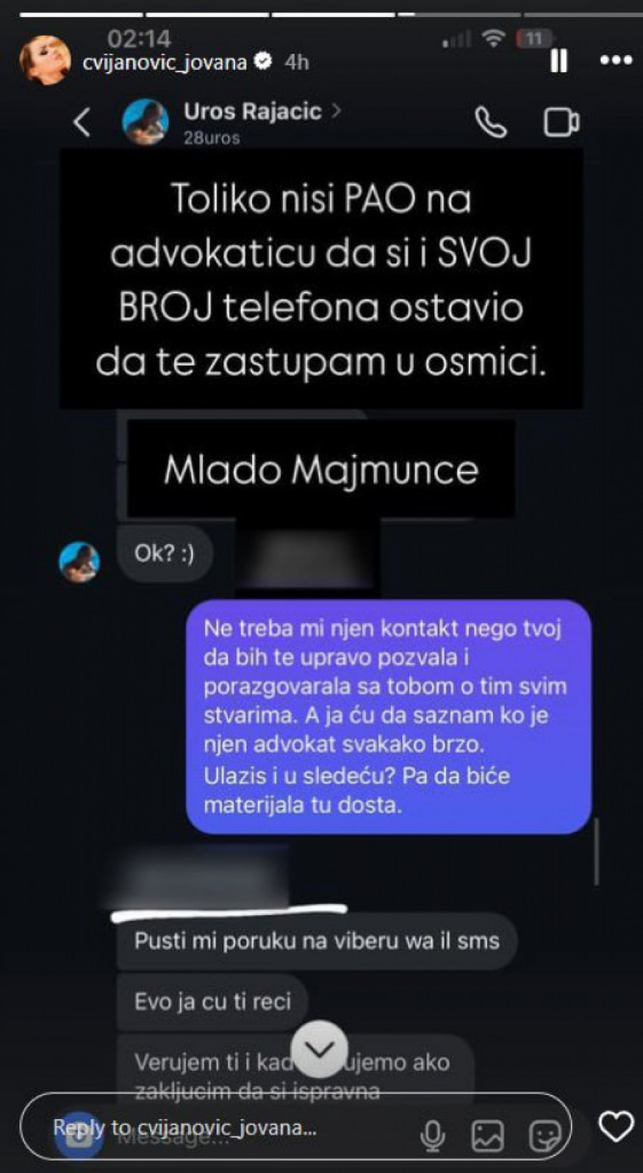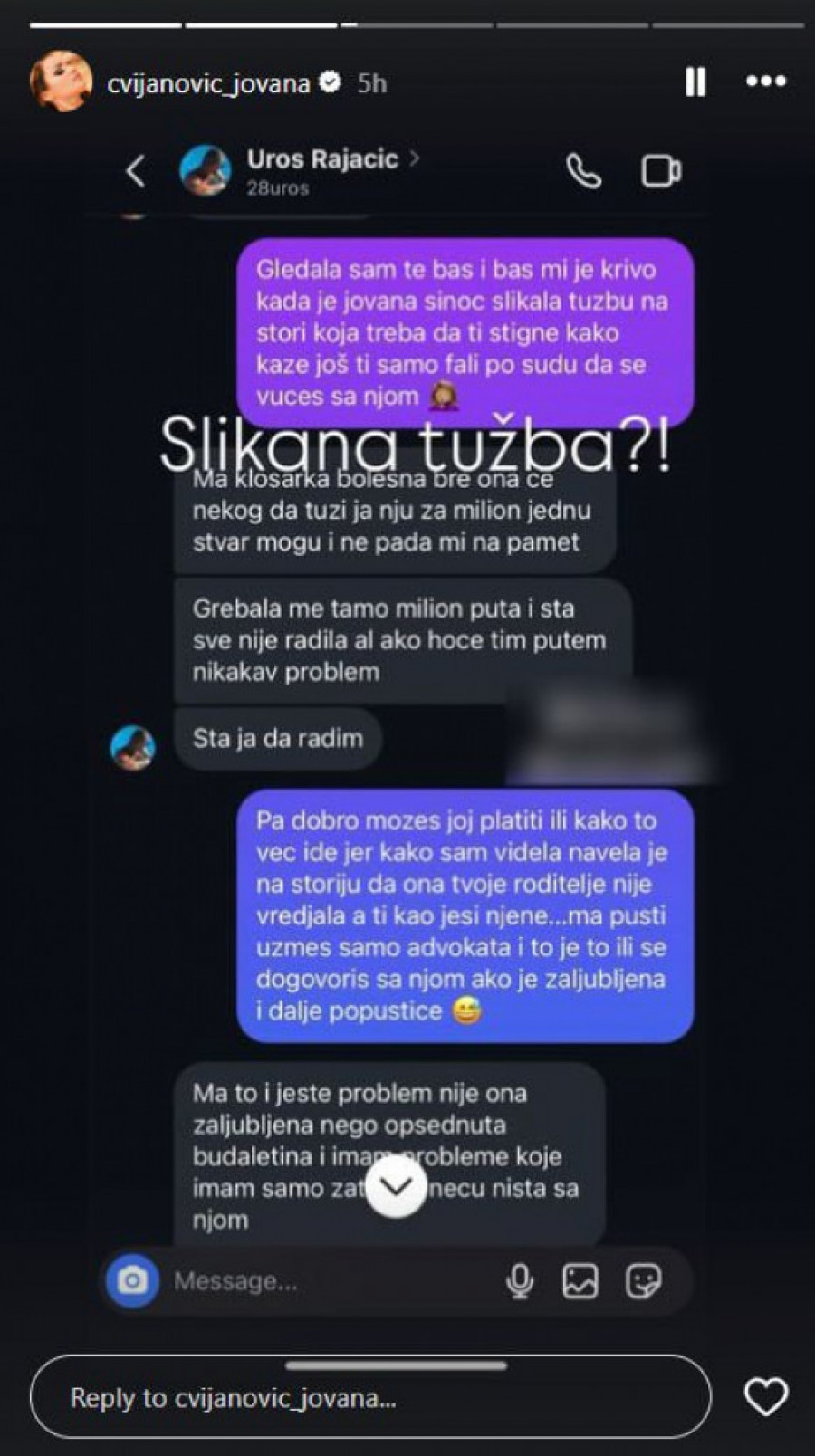 Bivša učesnica "Elite 7", pevačica Jovana Cvijanović, odlučila je da presavije tabak i tuži Uroša Rajačića. Ona je nedavno objavila privatne prepiske sa njim, gde se predstavila kao advokatica, sa kojom je Uroš pokušao da napravi pakleni plan.