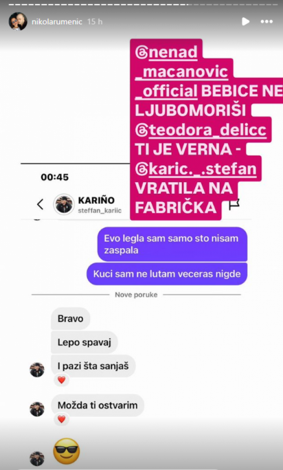 - Nikola je jako dobar momak, ja sam ga posmatrao i mislim da nije kvarna osoba. Što se tiče Slađe, mi smo se malo dopisivali na Instagramu. Ona je neko ko je dobar čovek. Ostavljam Škatarića - kazao je Karić.