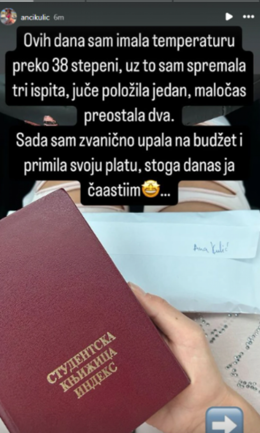 - Ovih dana sam imala temperaturu preko 38 stepeni. Uz to sam spremala tri ispita. Juče sam položila jedan, a maločas preostala dva. Sada sam zvanično upala na budžet i primila svoju platu. Stoga danas ja častim - napisala je Ana, uz fotografiju svog studentskog indeksa.